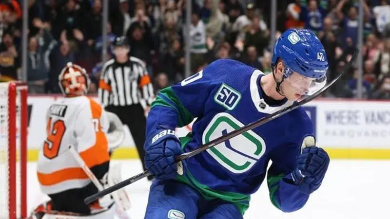 The left-winger beat Philadelphia Flyer netminder Carter Hart, getting it through his legs in the third round to secure Vancouver’s 3-2 home victory.
