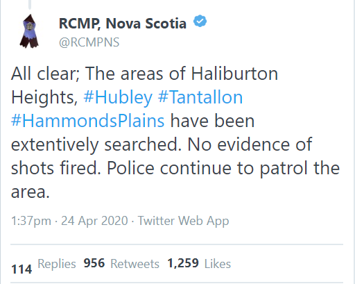 HALIFAX — Update: On its Twitter feed, the Nova Scotia RCMP has given the all clear, noting there has been “no evidence of shots fired.”