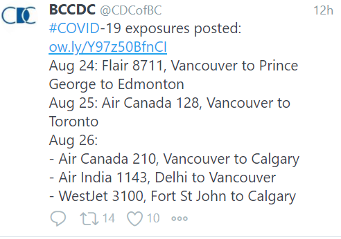 According to the BC Centre for Disease Control, it involved Flair Airlines flight 8711 on August 24, which travelled from Vancouver to Prince George and then on to Edmonton.