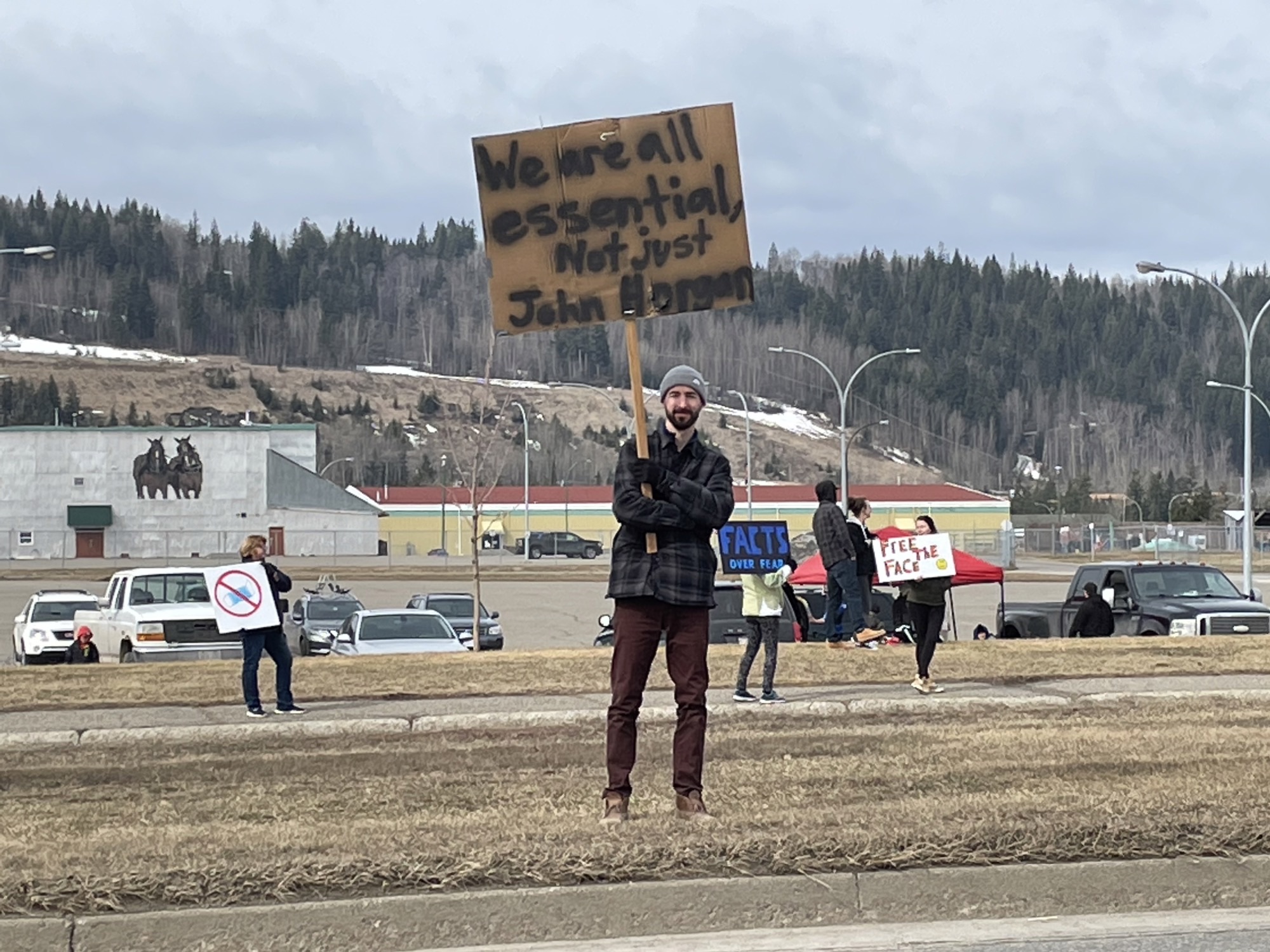 Prince George – On Saturday afternoon, 30 to 40 people gathered on both sides of Ospika Boulevard to peacefully protest the current restrictions in B.C.