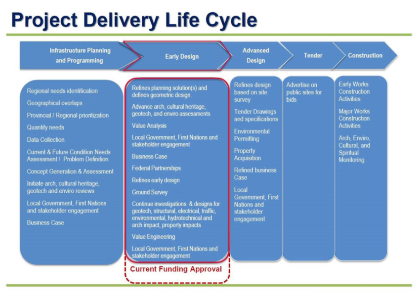 The project has had an early design completed and now waits for enough funding to complete an advanced design portion before the bidding process can begin, which will assess a number of factors including geotechnical, and work with First Nations.