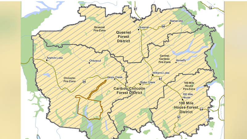 WILLIAMS LAKE, B.C. — Effective at noon on Friday (June 25), Category Two open burning, as well as other equipment and activities, will be prohibited throughout the Cariboo Fire Centre’s jurisdiction and the Tsilhqot’in (Xeni Gwet’in) Declared Title Area.