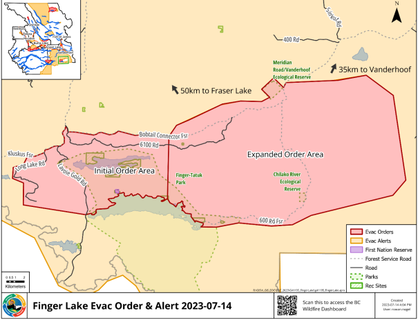 VANDERHOOF — An evacuation order expansion has been issued due to potential danger to life and health by Saik’uz First Nation, recreation sites and Trails BC and the Regional District of Bulkley-Nechako due to the Finger Lake wildfire.