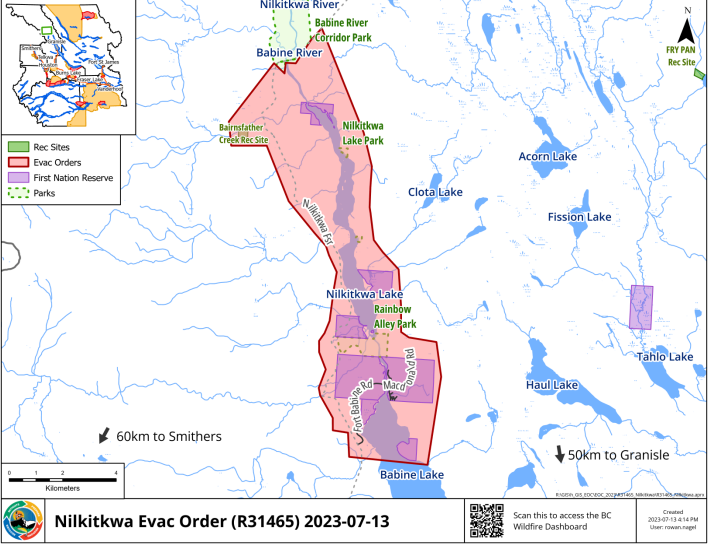 An evacuation order was issued Thursday night by Lake Babine Nation, the Regional District of Bulkley-Nechako, and Recreation Sites and Trails BC for the Nilkitkwa Wildfire. The order includes all properties, lands, dwellings, and roads surrounding Nilkitkwa Lake including Fort Babine and Nilkitkwa Forest Service Rd. and including Bairnsfather Creek Provincial Park.