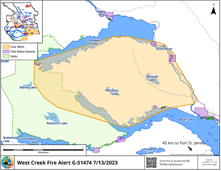 An Evacuation Alert was also issued by Tl’azt’en Nation and the Regional District of Bulkley-Nechako due to the West Creek Wildfire, for all lands and properties in the area South of Trembleur Lake, including the Tachie River and a portion of the north shore .