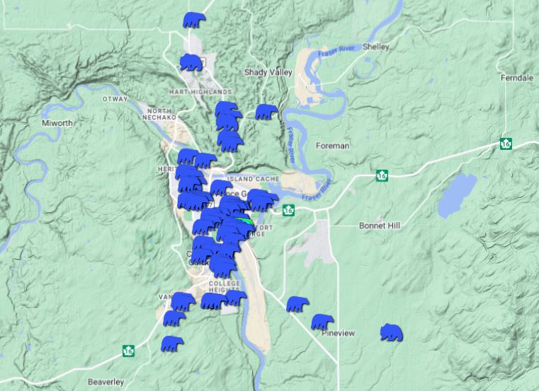 This map from the BC Conservation Foundation, shows how many bear sightings have been reported in Prince George and the surrounding area between July 28 and today.