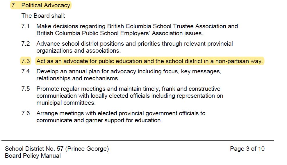 Board policy does state that the Board shall “act as an advocate for public education and the school district in a non-partisan way.”