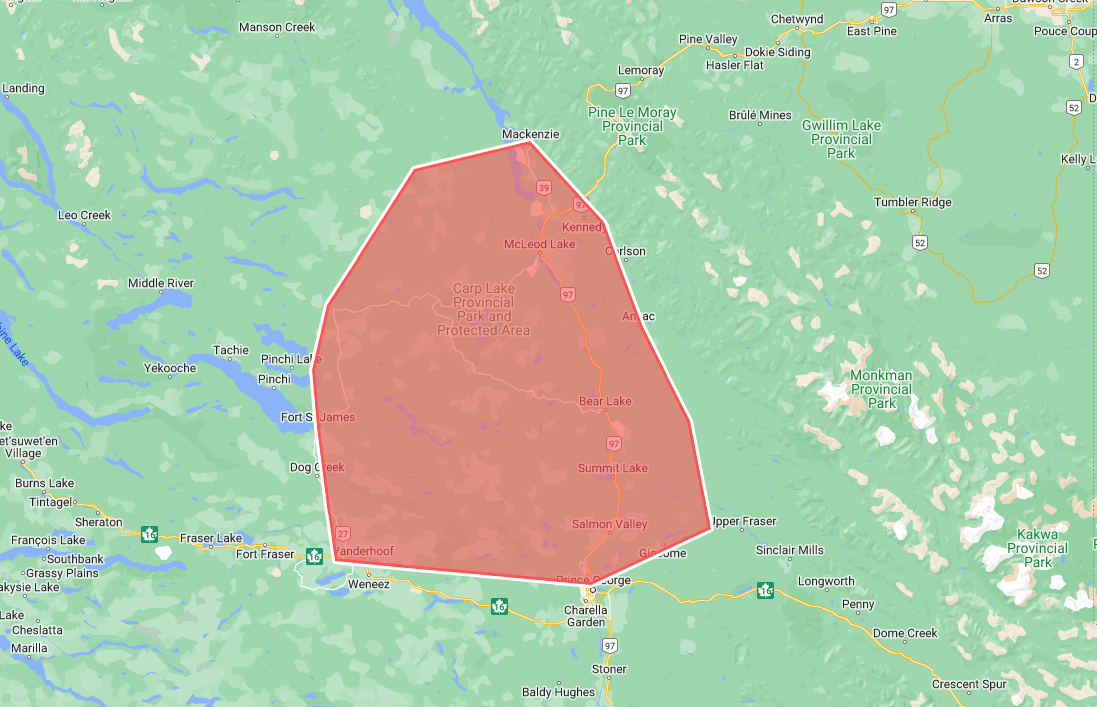 According to Enviroment Canada, a storm system will be crossing the B.C. Interior affecting Highway 97 from Bear lake to Link Creek, Carp Lake Provincial Park, McLeod Lake, Mackenzie, Fort St. James, and areas north of Prince George including Bear Lake.