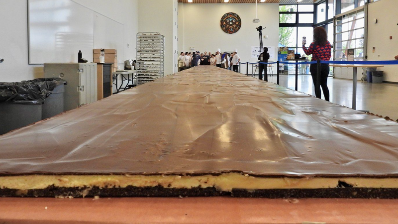 Baked by students at Vancouver Island University, the record-setting bar was unveiled to the public at noon on Saturday, and is 21.3 metres long, 0.9 metres wide and weighs nearly 500 kilograms.