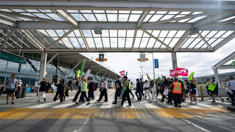 Picketers march around the departures level at the Vancouver International Airport on Sunday, Aug. 17, 2025. (Image Credit: Ethan Cairns/The Canadian Press)
