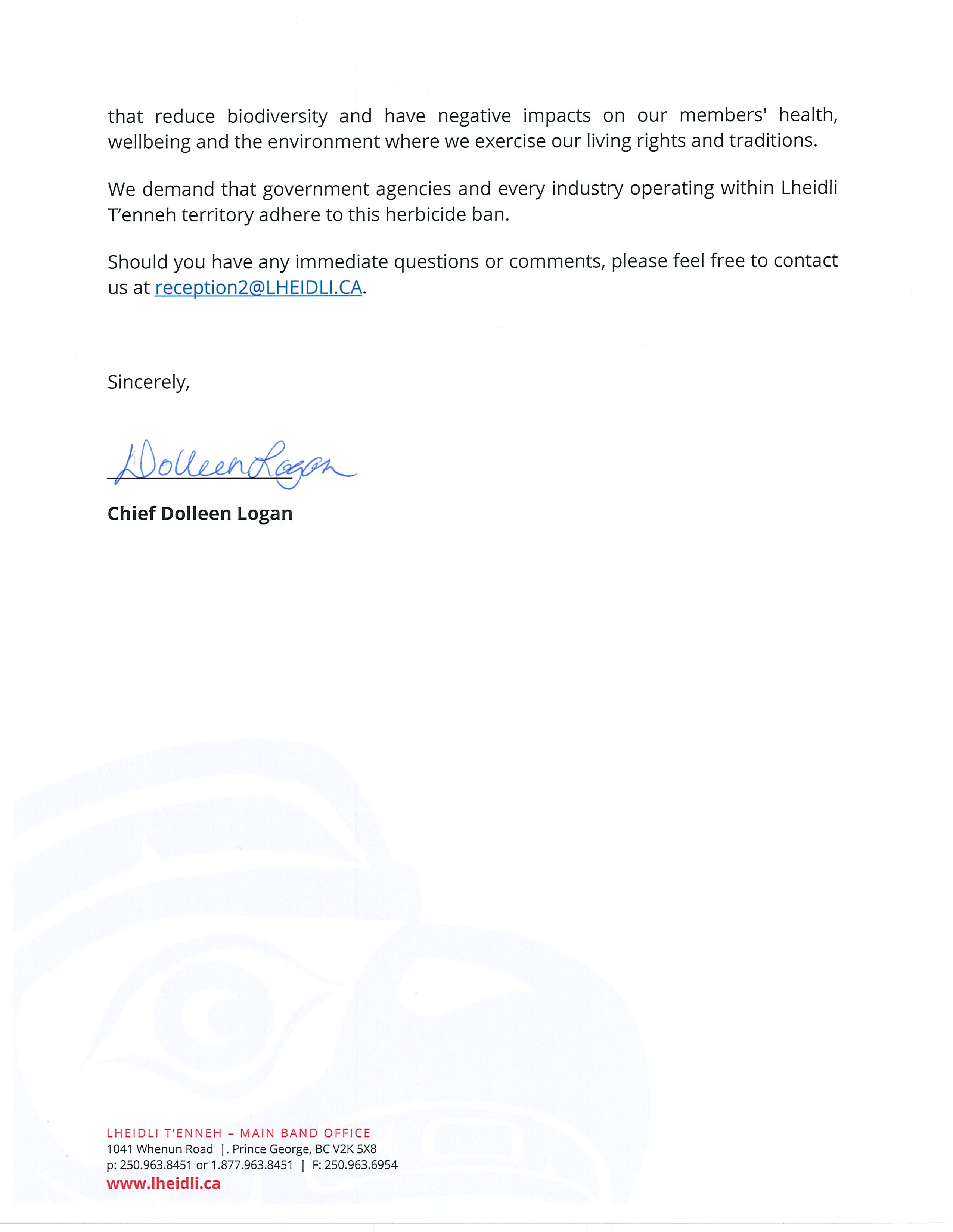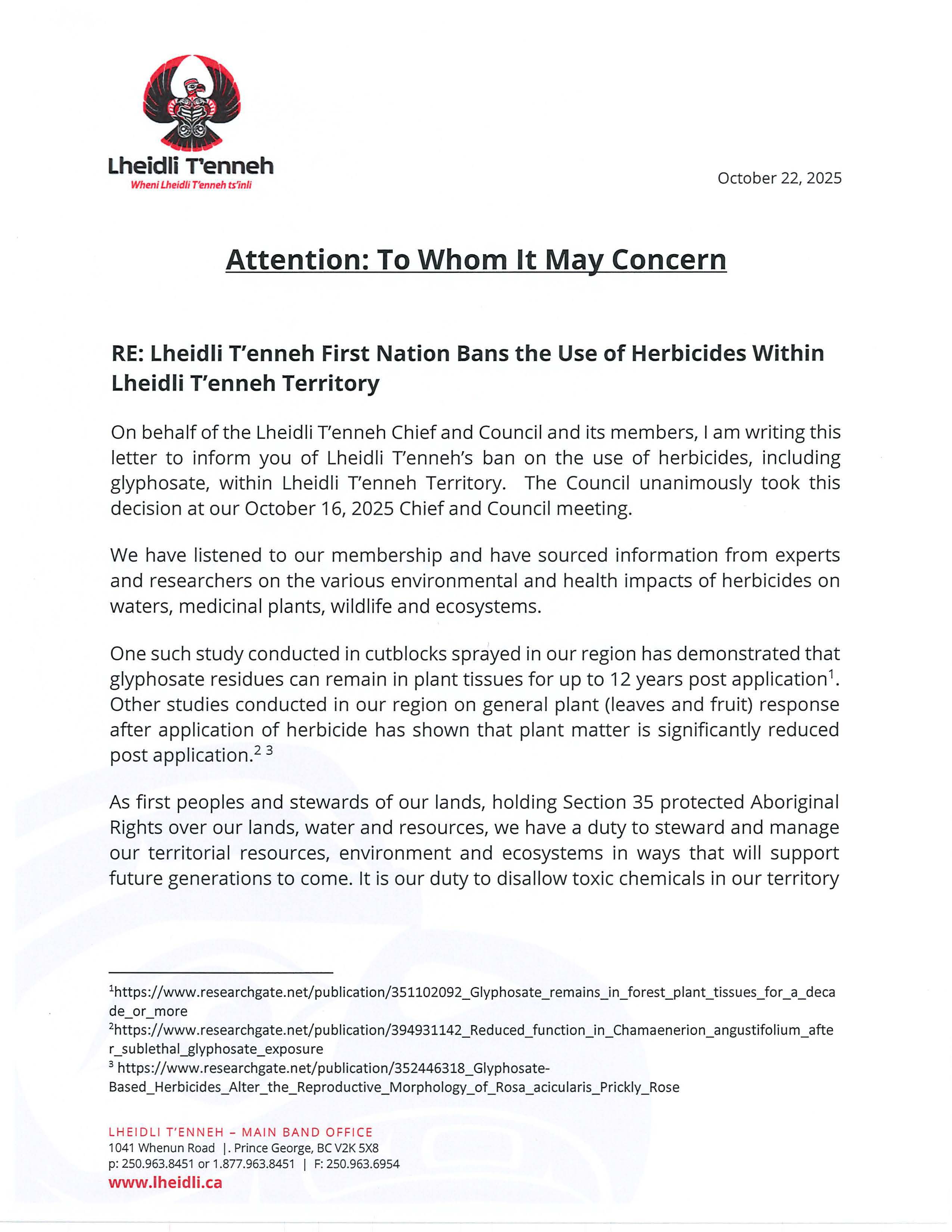 In an open letter, the First Nation demands that government agencies and all industries operating within its territory adhere to the herbicide ban.