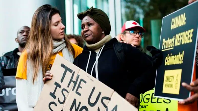 Dozens of protesters gathered outside a federal court on Monday called for Canada's asylum agreement with the United States to be suspended, arguing the U.S. is not a safe country for r...