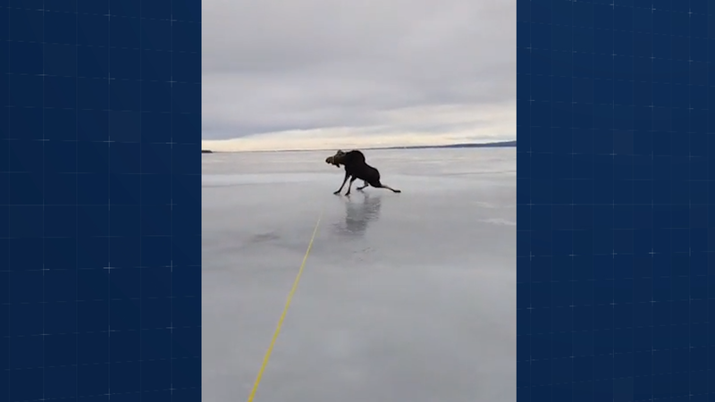 Moose stranded on frozen lake rescued by Binche residents.
