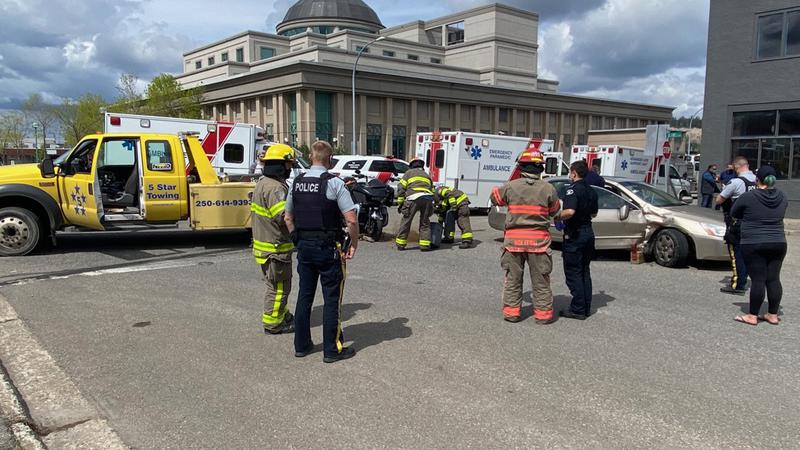 .PRINCE GEORGE -Two people have been sent to hospital following a two-vehicle collision early this afternoon.It happened just before 1:30 p.m. at 3rd Avenue and Queensway.The crash involved a motorcyc...